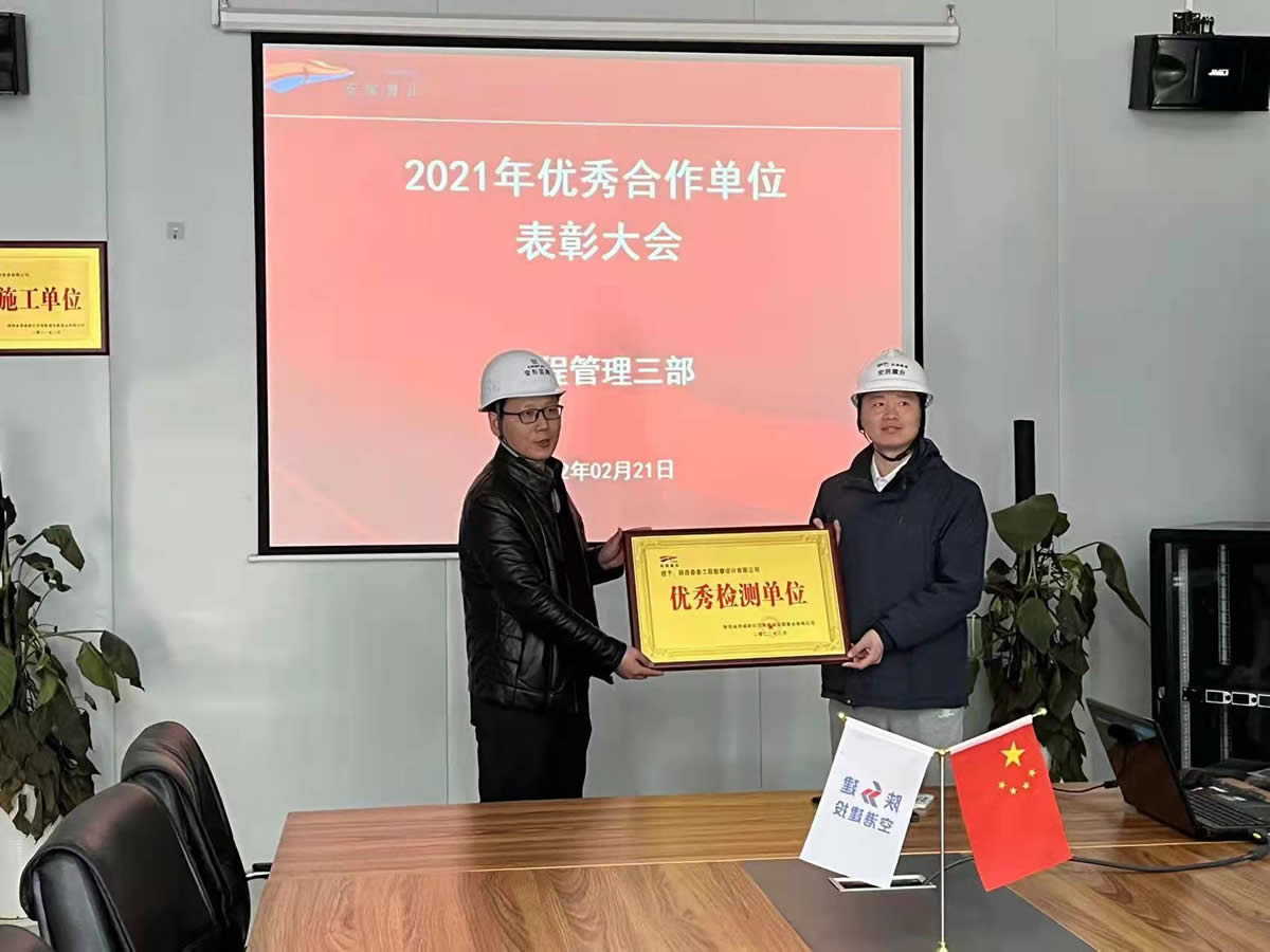 2022年2月21日,陜西省西咸新區(qū)空港新城安居置業(yè)有限公司召開“2021年度優(yōu)秀合作單位表彰大會(huì)”,我公司作為合作單位參加會(huì)議,并被授予“優(yōu)秀檢測(cè)單位”,頒發(fā)獎(jiǎng)牌。