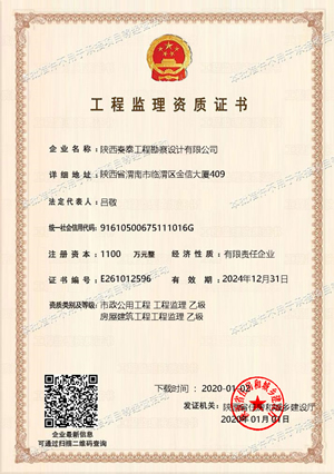 2020年1月1日,經(jīng)陜西省住房和城鄉(xiāng)建設(shè)廳審核批準(zhǔn),陜西秦泰工程勘察設(shè)計有限公司取得工程監(jiān)理專業(yè)(房屋建筑工程專業(yè)、市政公用工程專業(yè))雙乙級資質(zhì)證書。